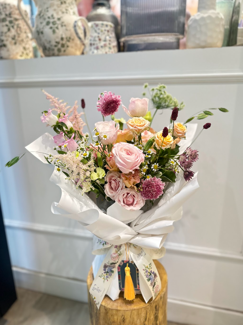 Please note that each of our bouquets are uniquely crafted and may vary slightly from what is pictured. We are using seasonal flowers and foliage so there may be slight variations but the colors and style will remain consistent. If there are any changes in the main flower materials, we will notify customers individually; otherwise, no further notice will be given.