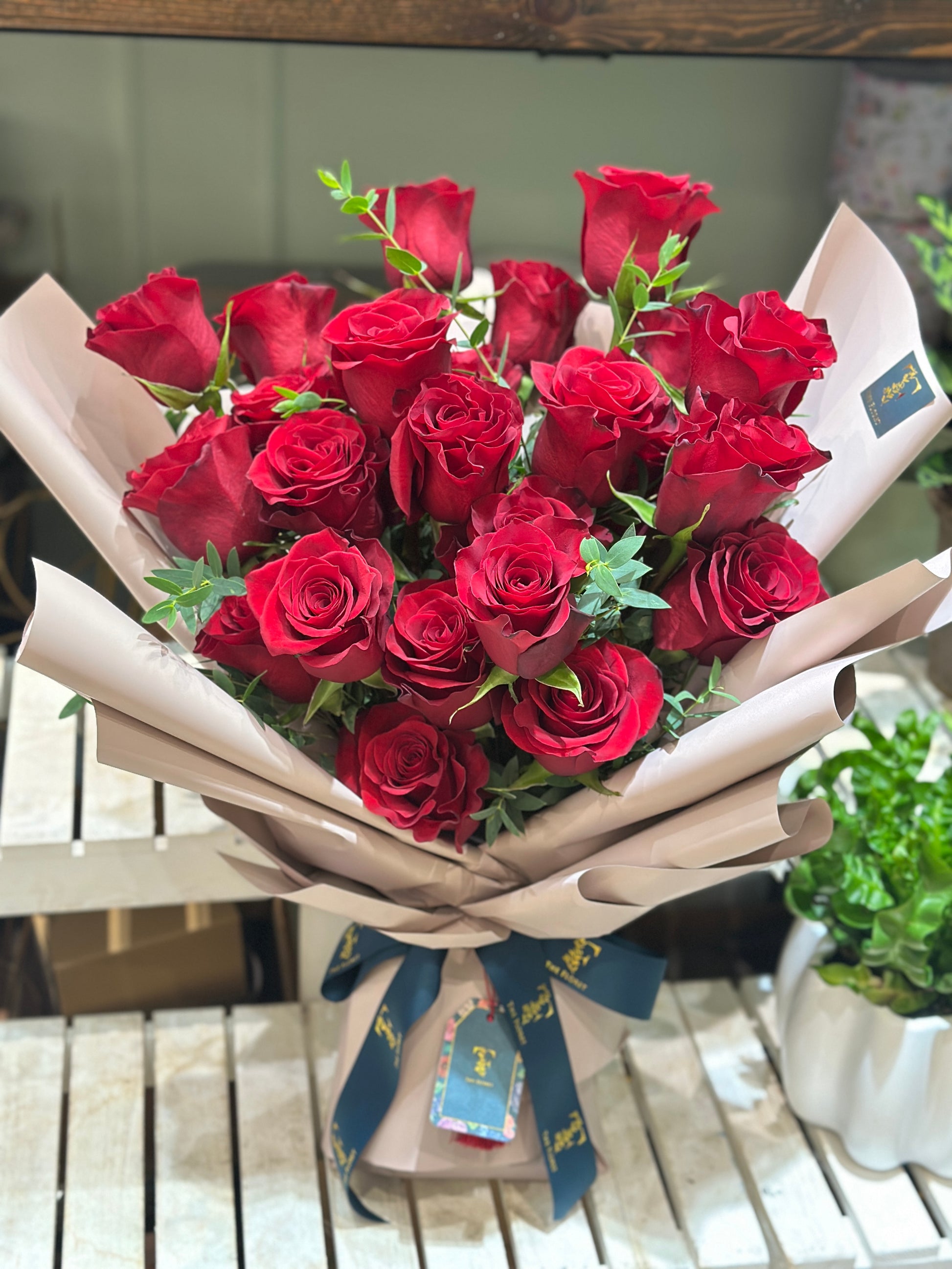 24枝玫瑰以圓頂形的手法為玫瑰帶來整齊、經典的形態,在生日或節日時作點綴乃是錦上添花,也為愛侶帶來滿滿的浪漫。