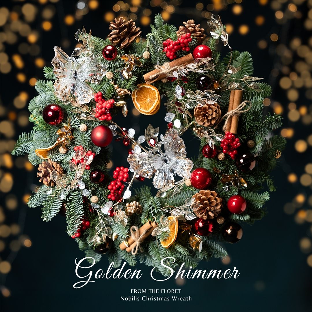 全新 Golden Shimmer 聖誕花環 以入口 Nobilis(貴族松)人手製作,質感豐厚、帶淡淡松香,配以金色點綴、紅果同松果,典雅耐看。掛大門、牆身或壁爐位都合襯。